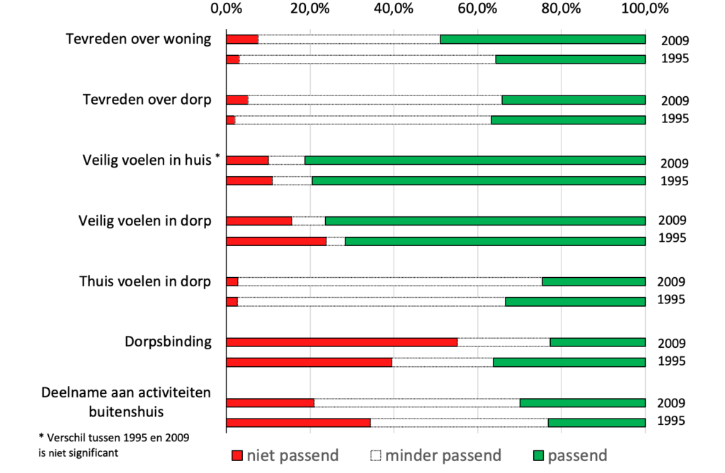 Een klein deel van de ouderen vindt dat zij in hun dorp niet passend wonen. Een samengestelde index voor person-environment fit is berekend door voor elk van de zeven indicatoren vast te stellen wanneer sprake is van passend dan wel niet passend wonen (figuur 2). Slechts een klein deel van de ouderen is in beide jaren ontevreden over de woning en het dorp en voelt zich onveilig. Ouderen voelen zich zelden niet thuis in het dorp. In 2009 is men tevredener over de eigen woning maar iets minder vaak tevreden over het dorp. In het dorp voelt men zich in 2009 veiliger dan in 1995. De dorpsbinding is in 2009 aanzienlijk minder, de deelname aan activiteiten buitenhuis is groter.