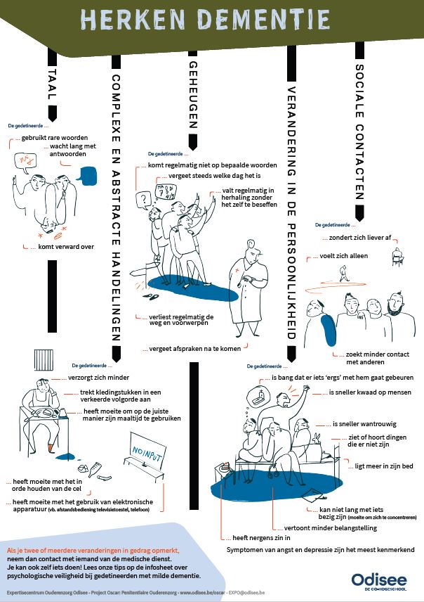 Vervolgens werd ingezet op de ontwikkeling van een aantal andere tools voor het werkveld. Er werd een e-learning, gebaseerd op de basiscursus, ontwikkeld. Deze beoogt, net als de basiscursus, de bewustwording omtrent verouderingsprocessen in detentie te vergroten, de noden van ouderen in detentie te detecteren en handvatten te bieden in de omgang met deze doelgroep. De e-learning is vrij toegankelijk waardoor ook andere professionals die omgaan met oudere personen in detentie deze basisopleiding kunnen volgen. Een bijbehorende set gesprekskaarten, ontwikkeld in een zusterproject en bedoeld om in gesprek te gaan met een oudere persoon omtrent zijn of haar behoeften, bleek ook voor dit project zinvol. Ten slotte bleek uit een bevraging van het werkveld dat er op het vlak van beginnende dementie nood was aan kennis en vaardigheden. Om aan deze vraag tegemoet te komen, ontwikkelden we twee zeer specifieke info-posters. Eén waarop de beginnende signalen van dementie in een detentiecontext zijn beschreven en geillustreerd, en één met concrete tips over het omgaan met mensen die milde symptomen van dementie vertonen. (NB: Deze posters kunnen worden opgevraagd bij een van de auteurs.)